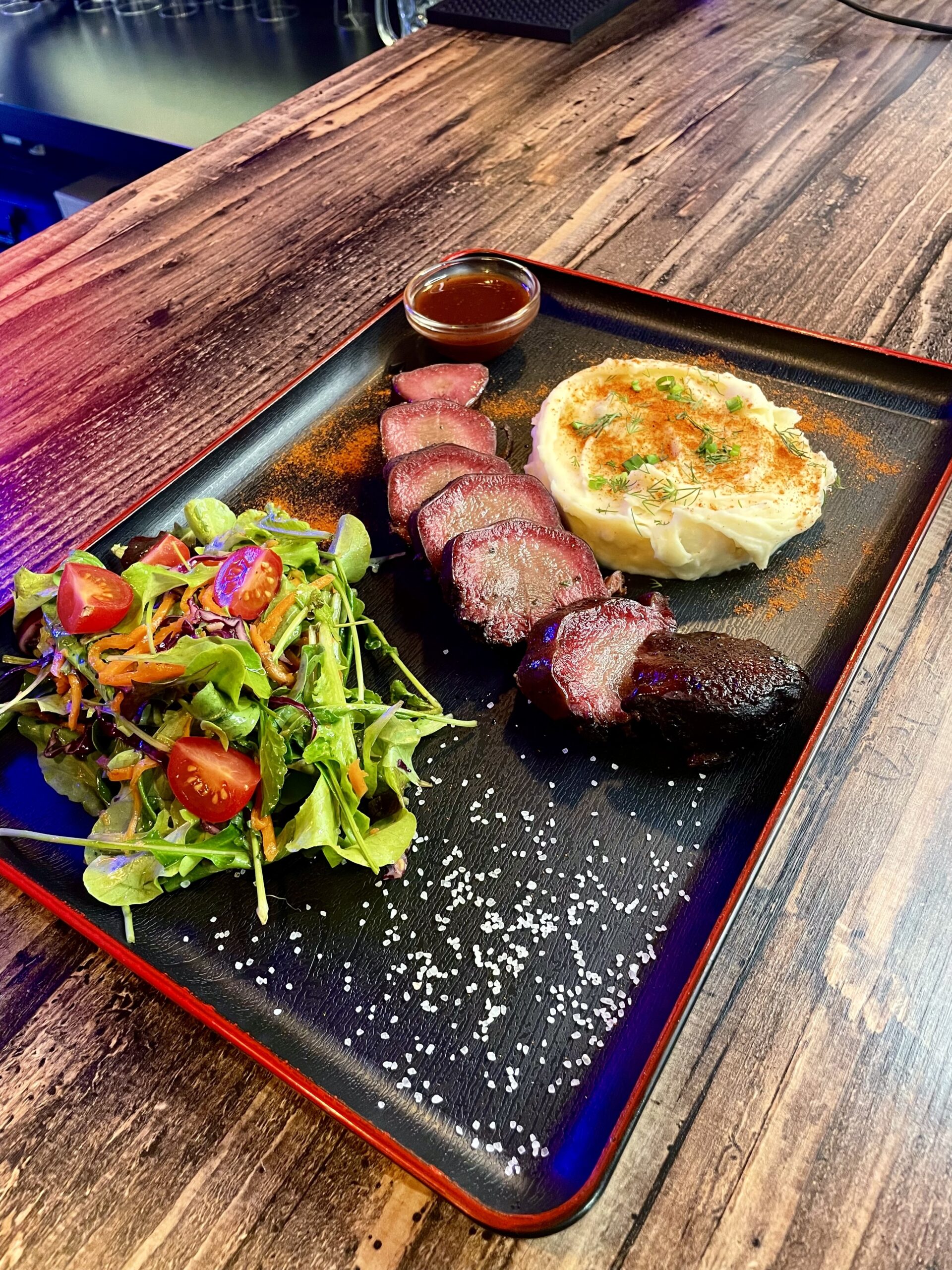 Копченый свиной язык с картофельным пюре и салат – 1000 гр