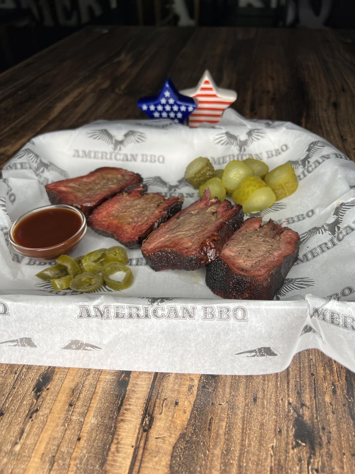 Копченый говяжий язык с малосольными огурцом на бурбоне, халапеньо и соусом барбекю