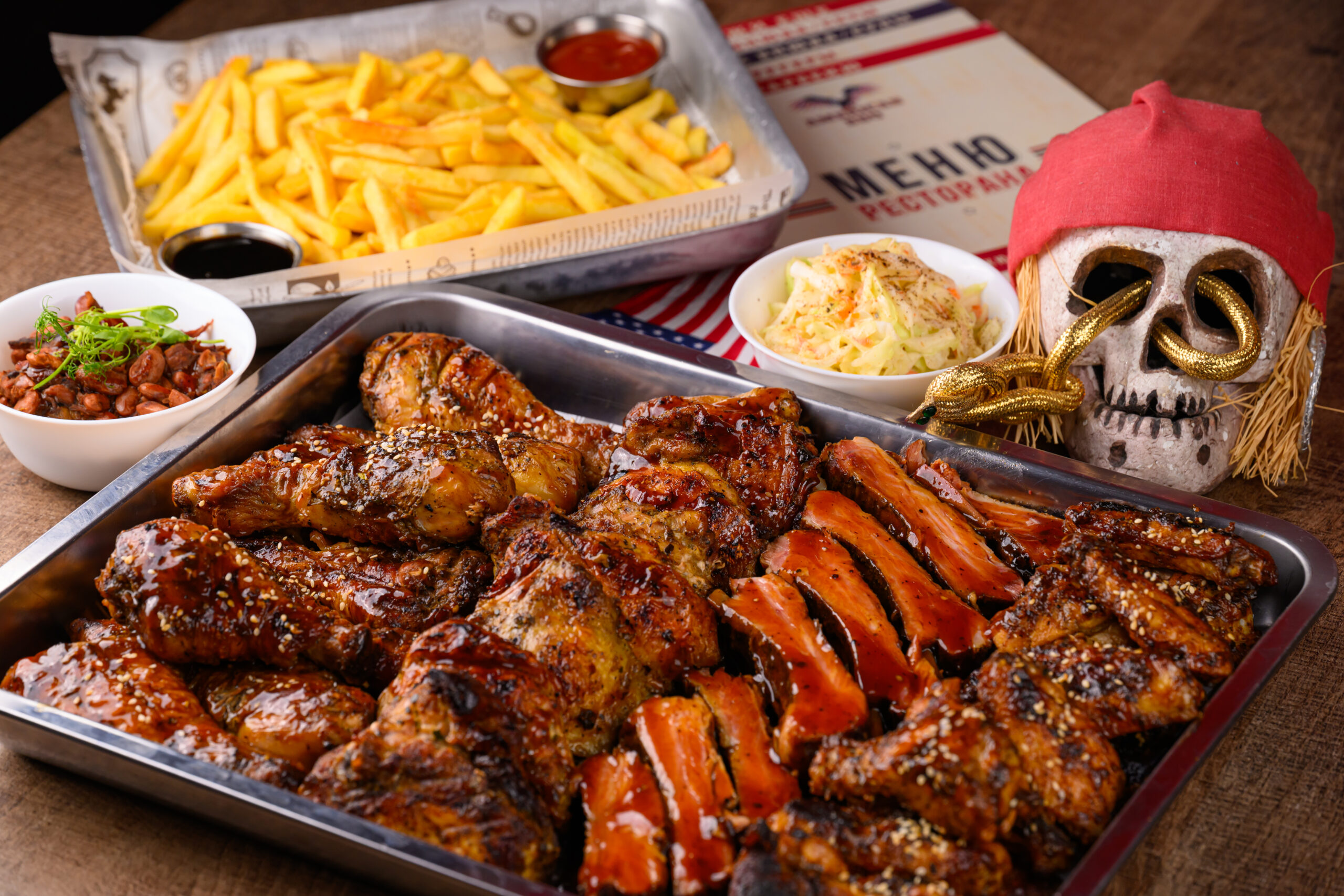 1 кг ребер барбекю, 1 кг куриных крылышек, 1 кг куриных ножек, 500 гр фасоль барбекю, 400 гр салат coslow, 500 гр картофеля фри, 100 гр соуса на выбор